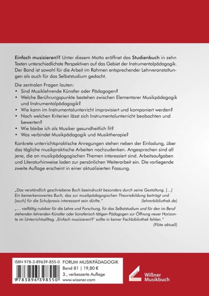Einfach musizieren!? Unter diesem Motto eröffnet das Studienbuch in zehn Texten unterschiedlichste Perspektiven auf das Gebiet der Instrumentalpädagogik. Der Band ist sowohl für die Arbeit im Rahmen entsprechender Lehrveranstaltungen als auch für das Selbststudium gedacht. Die zentralen Fragen lauten: - Sind Musiklehrende Künstler oder Pädagogen? - Welche Berührungspunkte bestehen zwischen Elementarer Musikpädagogik und Instrumentalpädagogik? - Wie kann im Instrumentalunterricht improvisiert und komponiert werden? - Nach welchen Kriterien lässt sich Instrumentalunterricht beobachten und bewerten? - Wie bleibe ich als Musiker gesundheitlich fit? - Was verbindet Musikpädagogik und Musiktherapie? Konkrete unterrichtspraktische Anregungen stehen neben der Einladung, über das tägliche musikpraktische Arbeiten nachzudenken. Angesprochen sind all jene, die an musikpädagogischen Themen interessiert sind. Arbeitsaufgaben und Literaturhinweise regen zur persönlichen Weiterarbeit an. Die2. Auflage erscheint in einer aktualisierten Fassung.