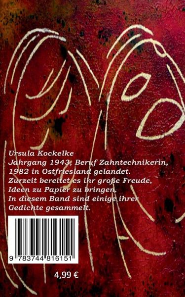 Ursula Kockelke Jahrgang 1943 erblickte in Wasserburg am Inn das Licht der Welt. Ihre Geburt, so wie ihr weiteres Leben, war und ist ein ständiges Auf und Ab. In der Schulzeit spielte sie im Orchester mit, und begeisterte sich für die angebotenen Arbeitsgemeinschaften. Durch handwerkliches Geschick, gepaart mit künstlerischer Begabung fiel sie positiv, mit zum Teil verrückten Ideen, auf. 1969 wanderte sie in die USA aus. Familiäre Gründe ließen sie nach Deutschland zurückkehren. Natur - und Tierliebe begleitet sie ihr ganzes Leben. Malen und Modellieren sind dem Hang zum Schreiben gewichen.