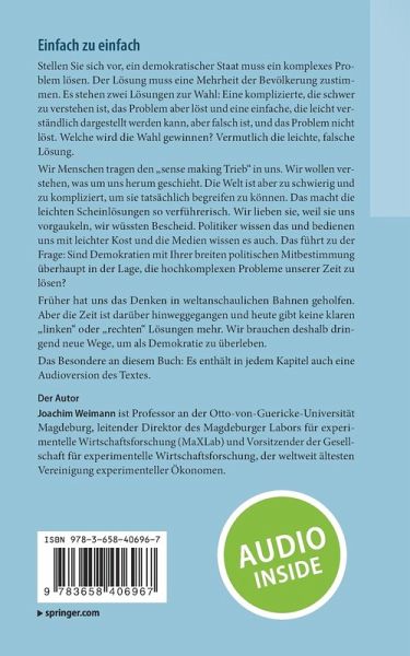 Wir Menschen tragen den "sense making Trieb" in uns. Wir wollen verstehen, was um uns herum geschieht. Die Welt ist aber zu schwierig und zu kompliziert, um sie tatsächlich begreifen zu können. Das macht die leichten Scheinlösungen so verführerisch. Wir lieben sie, weil sie uns vorgaukeln, wir wüssten Bescheid. Politiker wissen das und bedienen uns mit leichter Kost und die Medien wissen es auch. Das führt zu der Frage: Sind Demokratien mit Ihrer breiten politischen Mitbestimmung überhaupt in der Lage, die hochkomplexen Probleme unserer Zeit zu lösen?