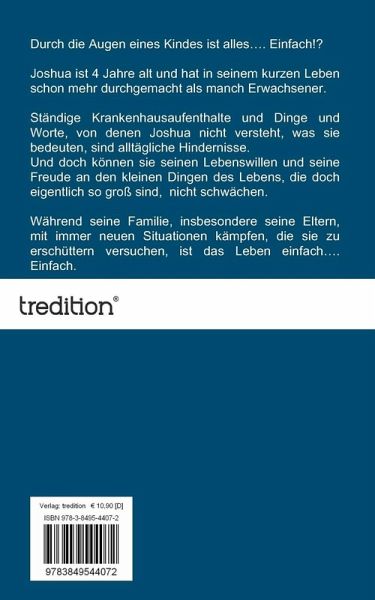 Einfach handelt von Joshuas Leben. Der kleine Junge hat es durch seine Krankheit, die unter anderem auch seine Sprache beeinträchtigt, nicht leicht. Immer wieder muss er sich neuen Herausforderungen stellen, die der Alltag für ihn bereithält. Was für andere Jungen in Joshuas Alter ein Leichtes ist, zeigt für Joshua oft Schwierigkeiten auf: Neue Freunde finden, mit der Familie kommunizieren, unbefangen toben und spielen. All diese Dinge sind für Joshua... einfach...Auf der anderen Seite stehen Joshuas Eltern und seine Familie. Nicht alle Angehörigen der Familie gehen mit Joshuas Situation gleichermaßen um. So ist Evelin, seine Mutter, beispielsweise sehr vorsichtig und immer darauf bedacht, Joshua keiner Gefahr auszusetzen, während sein Vater, David, darauf drängt, ihm ein Leben zu ermöglichen, dass so normal ist, wie das von Gleichaltrigen. Auch Großeltern und besonders Joshuas Patenonkel, Richard, der selbst versucht sein Leben zu meistern, spielen eine Große Rolle in Joshuas Leben. Auch sie beeinflussen, beeindrucken und prägen den 4-jährigen. Joshuas Geschichte wird also aus mehreren Perspektiven betrachtet. Nicht immer wird die Welt aus den Augen der Erwachsenen gesehen, die Joshua umgeben, sondern auch immer wieder aus seiner eigenen Sicht. Die unzähligen alltäglichen Dinge, die Joshua nicht versteht, versucht er sich zu erklären und schafft sich, mit Hilfe seiner Freunde, ein eigenes Bild von dieser komplizierten Welt. Er entdeckt die kleinen Wunder, die ihn umgeben und findet, dass das Leben doch eigentlich ganz einfach ist.