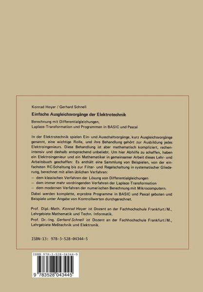 "Die Berechnung elektrischer Ausgleichsvorgänge ist sowohl bei Studenten als auch bei ausgebildeten Praktikern eine meist unbeliebte Beschäftigung. Der Grund dafür ist wohl, daß die dazu notwendige Mathematik nicht ganz anspruchslos ist. Dazu kommt, daß Grundlagenlehrbücher diesen Stoff notgedrungen sehr knapp anbieten und die einschlägigen Monographien für Anfänger viel zu schwierig sind. Um hier Abhilfe zu schaffen, haben sich ein Mathematiker und ein Elektrotechniker zu sammengetan und, gestützt auf langjährige Vorlesungserfahrung, eine wirklic. h elementare Einführung verfaßt. Es werden in diesem Buch parallel - die klassische Methode der Lösung von Differentialgleichungen, - die elegante Methode der Laplace-Transformation und - die moderne Methode der numerischen, digitalelektronischen Berechnung dargestellt. Insbesondere von der letzten Methode erwarten wir bei dem heutigen Stand der Technik der programmierbaren Taschenrechner eine stetig steigende Bedeutung für die Praxis.Es wurden aber alle drei Methoden soweit behandelt, wie sie ein Student der Elektrotechnik an Hoch- und Fachhochschule beherrschen muß. Auch Studenten ver wandter Fachrichtungen wollen wir ansprechen. " Die vorstehenden Zeilen stammen aus dem Vorwort der ersten und zweiten Auflage des Buches "Differentialgleichungen der Elektrotechnik". Sie gelten noch immer. Das vor liegende Buch ist eigentlich eine dritte Auflage, stellt aber eine vollständige Neubearbei tung dar und ist erweitert im Hinblick auf die neuen BASIC-fähigen Taschencomputer und die sowohl BASIC-als oftmals auch Pascal-fähigen Personalcomputer. Obwohl wir die Programme didaktisch aufbereitet haben, ist doch eine Vorkenntnis in BASIC und insbesondere Pascal notwendig.