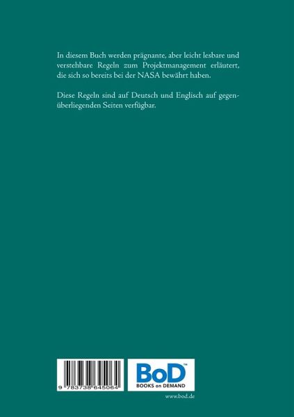 In diesem Buch werden prägnante, aber leicht lesbare und verstehbare Regeln zum Projektmanagement erläutert, die sich so bereits bei der NASA bewährt haben.Diese Regeln sind auf Deutsch und Englisch auf gegenüberliegenden Seiten verfügbar.