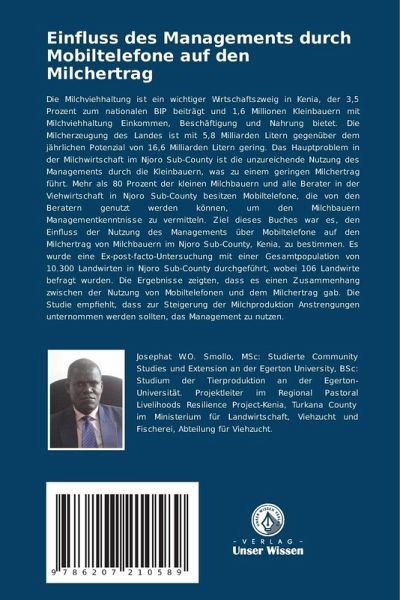 Die Milchviehhaltung ist ein wichtiger Wirtschaftszweig in Kenia, der 3,5 Prozent zum nationalen BIP beiträgt und 1,6 Millionen Kleinbauern mit Milchviehhaltung Einkommen, Beschäftigung und Nahrung bietet. Die Milcherzeugung des Landes ist mit 5,8 Milliarden Litern gegenüber dem jährlichen Potenzial von 16,6 Milliarden Litern gering. Das Hauptproblem in der Milchwirtschaft im Njoro Sub-County ist die unzureichende Nutzung des Managements durch die Kleinbauern, was zu einem geringen Milchertrag führt. Mehr als 80 Prozent der kleinen Milchbauern und alle Berater in der Viehwirtschaft in Njoro Sub-County besitzen Mobiltelefone, die von den Beratern genutzt werden können, um den Milchbauern Managementkenntnisse zu vermitteln. Ziel dieses Buches war es, den Einfluss der Nutzung des Managements über Mobiltelefone auf den Milchertrag von Milchbauern im Njoro Sub-County, Kenia, zu bestimmen. Es wurde eine Ex-post-facto-Untersuchung mit einer Gesamtpopulation von 10.300 Landwirten in Njoro Sub-County durchgeführt, wobei 106 Landwirte befragt wurden. Die Ergebnisse zeigten, dass es einen Zusammenhang zwischen der Nutzung von Mobiltelefonen und dem Milchertrag gab. Die Studie empfiehlt, dass zur Steigerung der Milchproduktion Anstrengungen unternommen werden sollten, das Management zu nutzen.