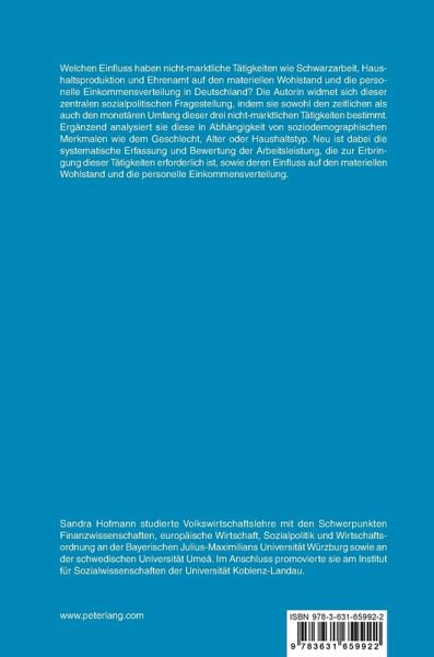 Welchen Einfluss haben nicht-marktliche Tätigkeiten wie Schwarzarbeit, Haushaltsproduktion und Ehrenamt auf den materiellen Wohlstand und die personelle Einkommensverteilung in Deutschland? Die Autorin widmet sich dieser zentralen sozialpolitischen Fragestellung, indem sie sowohl den zeitlichen als auch den monetären Umfang dieser drei nicht-marktlichen Tätigkeiten bestimmt. Ergänzend analysiert sie diese in Abhängigkeit von soziodemographischen Merkmalen wie dem Geschlecht, Alter oder Haushaltstyp. Neu ist dabei die systematische Erfassung und Bewertung der Arbeitsleistung, die zur Erbringung dieser Tätigkeiten erforderlich ist, sowie deren Einfluss auf den materiellen Wohlstand und die personelle Einkommensverteilung.