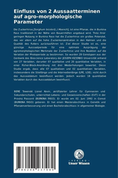 Die Zuckerhirse,[Sorghum bicolor(L.) Moench], ist eine Pflanze, die in Burkina Faso traditionell in der Nähe von Bauernhöfen angebaut wird. Trotz ihrer geringen Nutzung in Burkina Faso hat die Zuckerhirse ein großes Potenzial, das vor allem auf die hohe Zuckerkonzentration in den Halmen und die Qualität des Futters zurückzuführen ist. Ziel dieser Studie ist es, eine günstige Aussaatperiode für eine optimale Ausprägung der agromorphologischen Merkmale der Zuckerhirse und ihre Reaktion auf die Variation der Photoperiode zu bestimmen. So wurden 29 Genotypen aus der Genbank des Bioscience Laboratory der JOSEPH KIZERBO Universität anhand von 27 Variablen, darunter 07 qualitative und 20 quantitative Variablen, in einer Fisher-Block-Anordnung mit drei Wiederholungen bewertet. Diese Studie ergab, dass alle 07 qualitativen und 02 quantitativen Variablen, insbesondere die Stiellänge und die Internodienlänge (LPE, LOE), nicht durch das Aussaatdatum beeinflusst werden. Jedoch wurden 18 quantitative Variablen durch das Aussaatdatum beeinflusst.