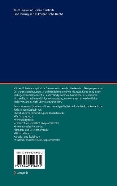Mit der Globalisierung sind die Grenzen zwischen den Staaten durchlässiger geworden. Der transnationale Austausch und Handel sind groß wie nie zuvor. Korea ist zu einem wichtigen Handelspartner für Deutschland geworden. Grundkenntnisse im koreanischen Recht sind eine wichtige Voraussetzung, um von einem unterschiedlichen Rechtsverständnis nicht überrascht zu werden. Geschrieben von Experten auf ihrem jeweiligen Gebiet stellt das Werk das koreanische Recht in neun Kapiteln vor: