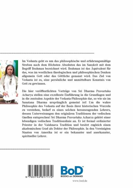 Im Vedanta geht es um das philosophische und erfahrungsmäßige Streben nach dem Höchsten Absoluten, das im Sanskrit mit dem Begriff Brahman bezeichnet wird. Brahman ist das Äquivalent für das, was im westlichen theologischen und philosophischen Denken allgemein als Gott oder als das Göttliche bezeichnet wird. Das Ziel von Vedanta ist es, eine persönliche und unmittelbare Kenntnis von Gott zu gewinnen!Die hier erstmals in deutscher Sprache veröffentlichten Vorträge von Sri Dharma Pravartaka Acharya stellen eine exzellente Einführung in die Grundlagen und in die zentralen Aspekte der Vedanta-Philosophie dar, so wie sie im Sanatana Dharma ursprünglich gemeint ist! Um die wahre Philosophie des Vedanta auf der Basis ihrer historischen Wurzeln zu verstehen, bedarf es eines solchen herausragenden Lehrers, dessen Unterweisungen den originären Traditionen der vedischen Quellen entsprechen!Sri Dharma Pravartaka Acharya gehört einer lebendigen vedischen Traditionslinie an. Er ist formal ordinierter Priester in der Vaishnava Tradition des Sanatana Dharma und besitzt zugleich einen akademischen Grad als Doktor der Philosophie, sowie unterschiedliche Titel und Auszeichnungen verschiedener amerikanischer Universitäten. In seiner Heimat, den Vereinigten Staaten von Amerika, ist er ein weithin bekannter und anerkannter, spiritueller Lehrer.