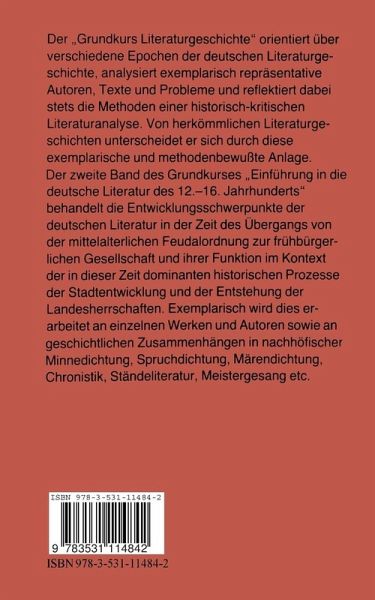 Aus dem Inhalt: Minnesang im späteren 13. Jahrhundert / Politische Spruchdichtung im 13. Jahrhundert / Oswald von Wolkenstein / Rudolf von Ems / Konrad von Würzburg / Märendichtung / Ständelehre und Ständekritik / Jans Enikel und die Weltchronistik im späteren Mittelalter / Johannes von Tepl: Der Ackermann aus Böhmen / Das geistliche Schauspiel.