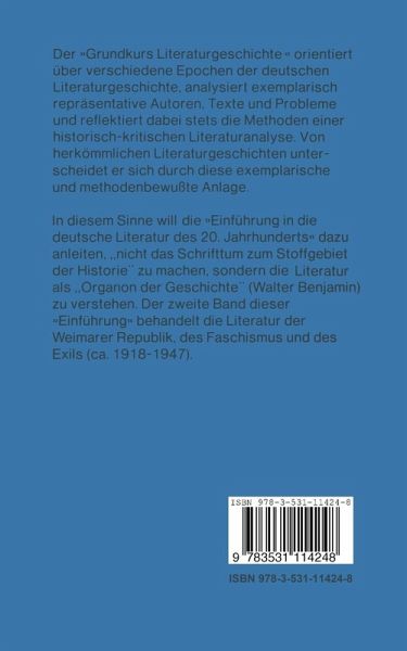 Aus dem Inhalt: Literatur im Zeitalter der Medienkonkurrenz / Heinrich Mann I / Thomas Mann I / Kriegsprosa: Remarque, Renn Jünger / Karl Kraus / Franz Kafka / Kabarettkultur / Gottfried Benn / Bertold Brecht I: Lyrik / Volksstück: Zuckmayer, Fleißer, Horvàth / Piscator-Bühne / Bertold Brecht II: Lehrstück-Konzept / Alfred Döblin / Robert Musil / Reportage: Reger, Hauser, Kisch / Literatur der Arbeiterbewegung I: Prosa / Literatur der Arbeiterbewegung II: Lyrik / Literatur der Arbeiterbewegung III: Drama / Literatur des deutschen Faschismus / "Innere Emigration" / Literatur im Exil / Bertold Brecht III: Exildramen / Heinrich Mann II / Thomas Mann II.