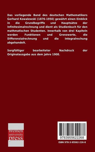 Das vorliegende Band des deutschen Mathematikers Gerhard Kowalewski (1876-1950) gewährt einen Einblick in die Grundbegriffe und Hauptsätze der Infinitesimalrechnung und dient als Studienbuch für den mathmatischen Studenten. Innerhalb von drei Kapiteln werden Funktionen und Grenzwerte, die Differenzialrechnung und die Integralrechung abgehandelt.