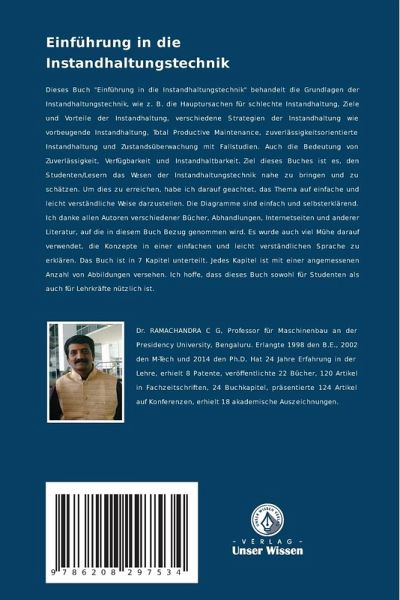 Dieses Buch "Einführung in die Instandhaltungstechnik" behandelt die Grundlagen der Instandhaltungstechnik, wie z. B. die Hauptursachen für schlechte Instandhaltung, Ziele und Vorteile der Instandhaltung, verschiedene Strategien der Instandhaltung wie vorbeugende Instandhaltung, Total Productive Maintenance, zuverlässigkeitsorientierte Instandhaltung und Zustandsüberwachung mit Fallstudien. Auch die Bedeutung von Zuverlässigkeit, Verfügbarkeit und Instandhaltbarkeit. Ziel dieses Buches ist es, den Studenten/Lesern das Wesen der Instandhaltungstechnik nahe zu bringen und zu schätzen. Um dies zu erreichen, habe ich darauf geachtet, das Thema auf einfache und leicht verständliche Weise darzustellen. Die Diagramme sind einfach und selbsterklärend. Ich danke allen Autoren verschiedener Bücher, Abhandlungen, Internetseiten und anderer Literatur, auf die in diesem Buch Bezug genommen wird. Es wurde auch viel Mühe darauf verwendet, die Konzepte in einer einfachen und leicht verständlichen Sprache zu erklären. Das Buch ist in 7 Kapitel unterteilt. Jedes Kapitel ist mit einer angemessenen Anzahl von Abbildungen versehen. Ich hoffe, dass dieses Buch sowohl für Studenten als auch für Lehrkräfte nützlich ist.