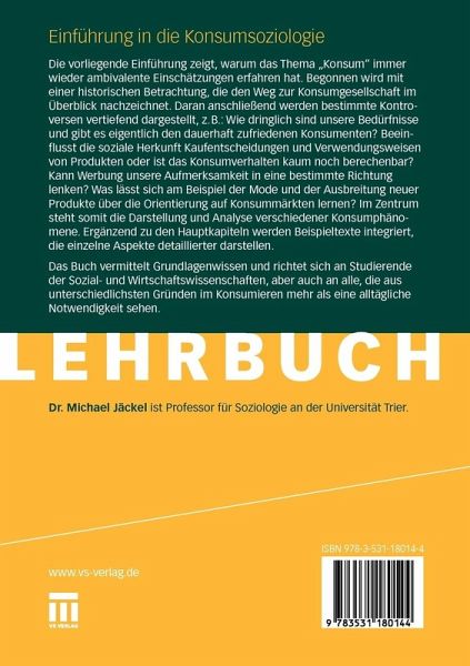 Pressestimmen zu Vorauflagen: "Das Themenspektrum ist [...] breit angelegt und man merkt dem Buch an, dass sein Autor seit vielen Jahren sowohl in der Forschung als auch in der Lehre zur Konsumsoziologie engagiert ist. Die einzelnen Essays sind kenntnisreich und stilistisch gut ausgearbeitet. Die etwa ein- bis fünfseitigen Beispieltexte sind kompetent ausgewählt und bieten einen illustrativen knappen Einblick in die jeweiligen Originaltexte." Soziologische Revue, 01/2007 "Verdienstvoll ist Jäckels Versuch, unverkrampft die unterschiedlichen Disziplinen, die sich mit Konsum im weiten Sinn beschäftigen, zu berücksichtigen." Testcard - Beiträge zur Popgeschichte, 15/2006 "Eine umfassende wissenschaftliche Einordnung des Konsumproblems [...]." Deutsche Jugend, 03/2006