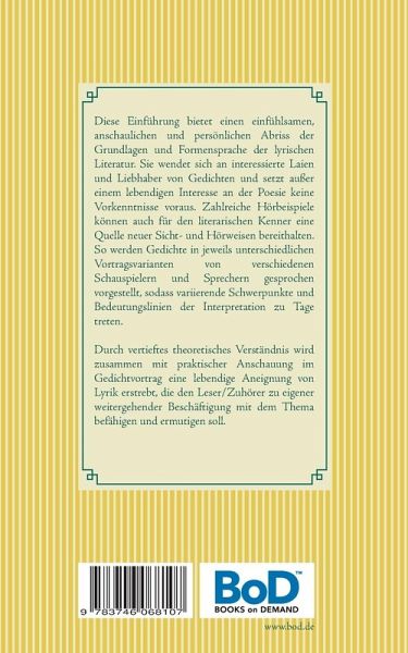 Diese Einführung bietet einen einfühlsamen, anschaulichen und persönlichen Abriss der Grundlagen und Formensprache der lyrischen Literatur. Sie wendet sich an interessierte Laien und Liebhaber von Gedichten und setzt außer einem lebendigen Interesse an der Poesie keine Vorkenntnisse voraus. Zahlreiche Hörbeispiele können auch für den literarischen Kenner eine Quelle neuer Sicht- und Hörweisen bereithalten. So werden Gedichte in jeweils unterschiedlichen Vortragsvarianten von verschiedenen Schauspielern und Sprechern gesprochen vorgestellt, sodass variierende Schwerpunkte und Bedeutungslinien der Interpretation zu Tage treten.Durch vertieftes theoretisches Verständnis wird zusammen mit praktischer Anschauung im Gedichtvortrag eine lebendige Aneignung von Lyrik erstrebt, die den Leser/Zuhörer zu eigener weitergehender Beschäftigung mit dem Thema befähigen und ermutigen soll.