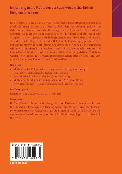 In den letzten Jahren hat die wissenschaftliche Beschäftigung mit Religion erheblich zugenommen. Sehr häufig fehlt den Forschenden jedoch das dafür notwendige methodische Rüstzeug. Hier will dieses Lehrbuch Abhilfe schaffen. Es führt ein in methodologische Prämissen und das praktische Vorgehen der etablierten sozialwissenschaftlichen Methoden und bezieht sie auf spezielle Gegebenheiten der Religion als Forschungsgegenstand. Der Forschungsprozess und ein breites Spektrum an Methoden der qualitativen wie der quantitativen Sozialforschung werden knapp vorgestellt sowie anhand beispielhafter Studien illustriert und erklärt. Alle dargestellten Verfahren werden in Hinblick auf Anwendungsmöglichkeiten erläutert und ihre Vor- und Nachteile, ihre Potentiale und Grenzen diskutiert.