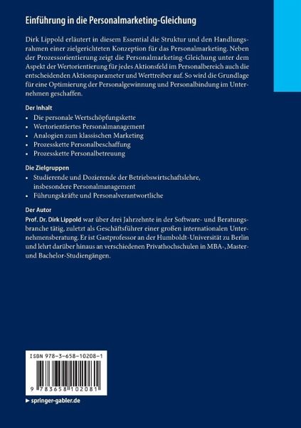 Dirk Lippold erläutert in diesem Essential die Struktur und den Handlungsrahmen einer zielgerichteten Konzeption für das Personalmarketing. Neben der Prozessorientierung zeigt die Personalmarketing-Gleichung unter dem Aspekt der Wertorientierung für jedes Aktionsfeld im Personalbereich auch die entscheidenden Aktionsparameter und Werttreiber auf. So wird die Grundlage für eine Optimierung der Personalgewinnung und Personalbindung im Unternehmen geschaffen.