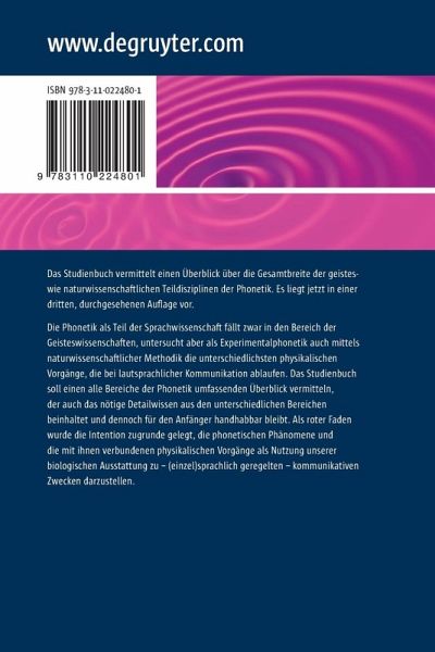 Dieses Studienbuch ist eine grundlegende Einführung in das Fach Phonetik als Teildisziplin der Allgemeinen Sprachwissenschaft. Alle Bereiche der Phonetik werden eingehend dargestellt (Phonation, Artikulation, Akustik, Perzeption usw.) und es wird eine kurze Geschichte des Faches geboten. Leitlinie der Einführung ist das Anliegen, die bei der lautsprachlichen Kommunikation beobachtbaren phonetischen Phänomene und die mit ihnen verbundenen Vorgänge in der physikalischen Welt als Nutzung unserer biologischen Ausstattung zu kommunikativen Zwecken darzustellen. Besonderes Gewicht wird im ersten Teil auf das Zusammenspiel von artikulatorischen, akustischen und auditiven Phänomenen gelegt. Der zweite symbolphonetische Teil behandelt die linguistische Phonetik unter dem Gesichtspunkt der Verwendung dieser Phänomene in Form einzelsprachlicher Lautsysteme und suprasegmentaler Systeme.