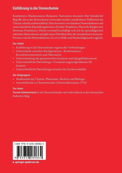 Konformere, Diastereomere, Rotamere, Tautomere, Anomere: Die Vielzahl der Begriffe, die in der Stereochemie verwendet werden, macht diesen Teilbereich der Chemie schnell unübersichtlich. Dazu kommen verschiedene Nomenklaturen und unterschiedliche Darstellungsformen (Fischer-Projektion, Haworth-Ringformel, Newman-Projektion). Dieses essential beschäftigt sich mit der grundlegenden statischen Stereochemie und gibt einen Überblick über die verschiedenen Isomerie-Formen und die Nomenklaturen. Es ist so Hilfe und Nachschlagewerk zugleich.