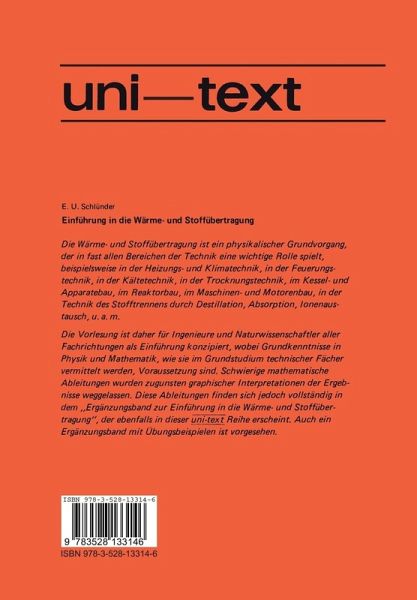 Inhaltsübersicht.- 1. Einführung in die Lehre von der Wärme- und Stoffübertragung.- 1.1 Wärmeübertragung durch Kontakt.- 1.2 Wärmeübertragung durch Strahlung.- 1.3 Stoffübertragung.- 2. Wärmeübertragung durch stationäre Wärmeleitung an ruhende Körper.- 2.1 Das Fourier'sche Grundgesetz der Wärmeleitung.- 2.2 Der stationäre Wärmefluß durch Platten, Zylinder- und Kugelschalen.- 2.3 Stationäre Temperaturfelder mit Wärmequellen.- 2.4 Definition eines Wärmeübergangskoeffizienten.- 3. Wärmeübertragung durch instationäre Wärmeleitung an ruhende Körper.- 3.1 Berechnung des Temperaturfeldes.- 3.2 Definition eines Wärmeübergangskoeffizienten.- 3.3 Die praktische Berechnung der Auskühlung (Aufheizung) von Körpern bei konstanter Oberflächentemperatur.- 4. Wärmeübertragung durch stationäre Wärmeleitung an bewegte Körper.- 4.1 Berechnung des Temperaturfeldes und der Wärmeübergangskoeffizienten.- 5. Wärmeübertragung durch stationäre Wärmeleitung an laminar strömende Flüssigkeiten und Gase.- 5.1 Berechnung des Temperaturfeldes und der Wärmeübergangskoeffizienten.- 6. Wärmeübertragung durch stationäre Wärmeleitung an turbulent strömende Flüssigkeiten und Gase in Rohren und hydraulisch ähnlichen Querschnitten.- 7. Zusammenfassende Darstellung der Grundgesetze der Wärmeübertragung durch Kontakt an ruhende und bewegte Festkörper sowie an durchströmte Kanäle.- 8. Wärmeübertragung an überströmte Einzelkörper bei erzwungener und freier Strömung.- 8.1. Die überströmte Platte bei erzwungener Strömung.- 8.2. Überströmte Einzelkörper verschiedener Form bei erzwungener Strömung.- 8.3. Die überströmte Platte bei freier Strömung.- 8.4. Einzelkörper verschiedener Form bei freier Strömung.- 8.5. Überlagerung von erzwungenerund freier Strömung.- 8.6. Zusammenfassende Darstellung des Wärmeübergangs an überströmte Einzelkörper verschiedener Form bei erzwungener und freier Konvektion.- 9. Wärmeübertragung in durchströmten Haufwerken.- 10. Wärmeübertragung bei der Kondensation.- 10.1 Kondensation von ruhendem Dampf.- 10.2 Kondensation von strömendem Dampf.- 11. Wärmeübertragung bei der Verdampfung.- 11.1 Verdampfung von ruhenden Flüssigkeiten.- 11.2 Verdampfung von strömenden Flüssigkeiten.- 12. Wärmeübertragung durch Strahlung.- 12.1 Strahlungsenergie.- 12.2 Strahlungsaustausch zwischen Oberflächen fester Körper von bestimmter geometrischer Form.- 12.3 Definition eines Wärmeübergangskoeffizienten.- 13. Reihenschaltung mehrerer Wärmeübergangswiderstände, Wärmedurchgang.- 13.1 Der Wärmedurchgangskoeffizient.- 13.2 Die mittlere Temperaturdifferenz.- 13.3 Die näherungsweise Berechnung der Auskühlung (Aufheizung) von Körpern bei konstanter Umgebungstemperatur.- 14. Stoffübertragung durch stationäre Diffusion an ruhende binäre Gemische.- 14.1 Grundgleichungen der Diffusion.- 14.2 Äquimolare Diffusion.- 14.3 Einseitige Diffusion.- 15. Stoffübertragung durch stationäre Diffusion an laminar und turbulent strömende Flüssigkeiten und Gase.