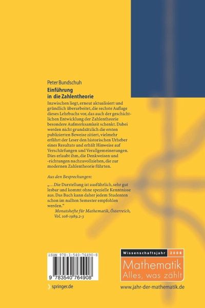 Inzwischen liegt, erneut gründlich überarbeitet und aktualisiert, die sechste Auflage dieses Lehrbuchs vor, das auch der geschichtlichen Entwicklung der Zahlentheorie besondere Aufmerksamkeit schenkt. Dabei werden nicht grundsätzlich die ersten publizierten Beweise zitiert, vielmehr erfährt der Leser den historischen Urheber eines Resultats und erhält Hinweise auf Verschärfungen und Verallgemeinerungen. Dies erlaubt ihm, die Denkweisen und -richtungen nachzuvollziehen, die zur modernen Zahlentheorie führten.
