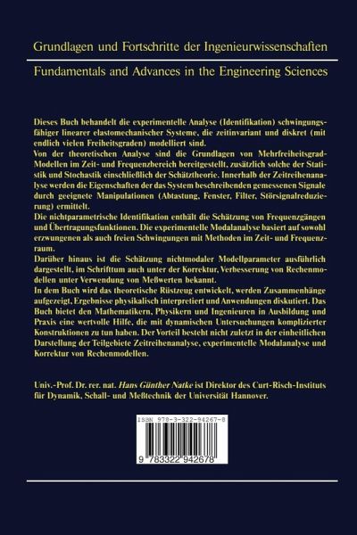 Dieses Buch behandelt die experimentelle Analyse (Identifikation) schwingungsfähiger linearer elastomechanischer Systeme, die zeitinvariant und diskret (mit endlich vielen Freiheitsgraden) modelliert sind. Von der theoretischen Analyse sind die Grundlagen von Mehrfreiheitsgrad-Modellen im Zeit- und Frequenzbereich bereit gestellt, zusätzlich solche der Statistik und Stochastik einschließlich der Schätztheorie. Innerhalb der Zeitreihenanalyse werden die Eigenschaften der das System beschreibenden gemessenen Signale durch geeignete Manipulationen (Abtastung, Fenster, Filter, Störsignalreduzierung) ermittelt. Die nichtparametrische Identifikation enthält die Schätzung von Frequenzgängen und Übertragungsfunktionen. Die experimentelle Modalanalyse basiert auf sowohl erzwungenen als auch freien Schwingungen mit Methoden im Zeit- und Frequenzraum. Darüber hinaus ist die Schätzung nichtmodaler Modellparameter ausführlich dargestellt, im Schrifttum auch unter der Korrektur, Verbesserung von Rechenmodellen unter Verwendung von Messwerten bekannt. In dem Buch wird das theoretische Rüstzeug entwickelt, werden Zusammenhänge aufgezeigt, Ergebnisse physikalisch interpretiert und Anwendungen diskutiert. Das Buch bietet Mathematikern, Physikern und Ingenieuren in Ausbildung und Praxis eine wertvolle Hilfe, die mit dynamischen Untersuchungen komplizierter Konstruktionen zu tun haben. Der Vorteil besteht nicht zuletzt in der einheitlichen Darstellung der Teilgebiete Zeitreihenanalyse, experimentelle Modalanalyse und Korrektur von Rechenmodellen.