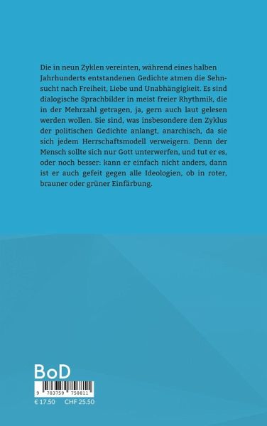 Die in diesem Band in neun thematisch unterschiedlichen Zyklen vereinten, während eines halben Jahrhunderts entstandenen Gedichte, atmen die Sehnsucht nach Freiheit, Liebe und Un-abhängigkeit. Es sind dialogische Sprachbilder in meist freier Rhythmik, die in der Mehrzahl getragen, ja, laut gelesen werden wollen. Sie sind, was insbesondere den Zyklus der politischen Gedichte anlangt, anarchisch, da sie sich jedem Herrschaftsmodell verweigern. Denn der Mensch sollte sich nur Gott unterwerfen, und tut er es, oder noch besser: kann er einfach nicht anders, dann ist er auch gefeit gegen alle Ideologien, ob in roter, brauner oder grüner Einfärbung.