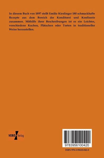 In diesem Buch von 1897 stellt Emilie Kieslinger 180 schmackhafte Rezepte aus dem Bereich der Konditorei und Konfiserie zusammen. Mithilfe ihrer Beschreibungen ist es ein Leichtes, verschiedene Kuchen, Plätzchen oder Torten in traditioneller Weise herzustellen.