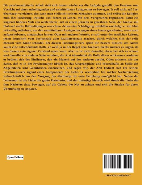 Die psychoanalytische Arbeit sieht sich immer wieder vor die Aufgabe gestellt, den Kranken zum Verzicht auf einen naheliegenden und unmittelbaren Lustgewinn zu bewegen. Er soll nicht auf Lust überhaupt verzichten; das kann man vielleicht keinem Menschen zumuten, und selbst die Religion muß ihre Forderung, irdische Lust fahren zu lassen, mit dem Versprechen begründen, dafür ein ungleich höheres Maß von wertvollerer Lust in einem Jenseits zu gewähren. Nein, der Kranke soll bloß auf solche Befriedigungen verzichten, denen eine Schädigung unfehlbar nachfolgt, er soll bloß zeitweilig entbehren, nur den unmittelbaren Lustgewinn gegen einen besser gesicherten, wenn auch aufgeschobenen, eintauschen lernen. Oder mit anderen Worten, er soll unter der ärztlichen Leitung jenen Fortschritt vom Lustprinzip zum Realitätsprinzip machen, durch welchen sich der reife Mensch vom Kinde scheidet. Bei diesem Erziehungswerk spielt die bessere Einsicht des Arztes kaum eine entscheidende Rolle; er weiß ja in der Regel dem Kranken nichts anderes zu sagen, als was diesem sein eigener Verstand sagen kann. Aber es ist nicht dasselbe, etwas bei sich zu wissen und dasselbe von anderer Seite zu hören; der Arzt übernimmt die Rolle dieses wirksamen Anderen; er bedient sich des Einflusses, den ein Mensch auf den anderen ausübt. Oder: erinnern wir uns daran, daß es in der Psychoanalyse üblich ist, das Ursprüngliche und Wurzelhafte an Stelle des Abgeleiteten und Gemilderten einzusetzen, und sagen wir, der Arzt bedient sich bei seinem Erziehungswerk irgend einer Komponente der Liebe. Er wiederholt bei solcher Nacherziehung wahrscheinlich nur den Vorgang, der überhaupt die erste Erziehung ermöglicht hat. Neben der Lebensnot ist die Liebe die große Erzieherin, und der unfertige Mensch wird durch die Liebe der ihm Nächsten dazu bewogen, auf die Gebote der Not zu achten und sich die Strafen für deren Übertretung zu ersparen.