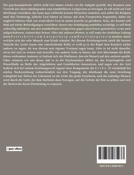 Die psychoanalytische Arbeit sieht sich immer wieder vor die Aufgabe gestellt, den Kranken zum Verzicht auf einen naheliegenden und unmittelbaren Lustgewinn zu bewegen. Er soll nicht auf Lust überhaupt verzichten; das kann man vielleicht keinem Menschen zumuten, und selbst die Religion muß ihre Forderung, irdische Lust fahren zu lassen, mit dem Versprechen begründen, dafür ein ungleich höheres Maß von wertvollerer Lust in einem Jenseits zu gewähren. Nein, der Kranke soll bloß auf solche Befriedigungen verzichten, denen eine Schädigung unfehlbar nachfolgt, er soll bloß zeitweilig entbehren, nur den unmittelbaren Lustgewinn gegen einen besser gesicherten, wenn auch aufgeschobenen, eintauschen lernen. Oder mit anderen Worten, er soll unter der ärztlichen Leitung jenen F o r t s c h r i t t v o m L u s t p r i n z i p z u m R e a l i t ä t s p r i n z i p machen, durch welchen sich der reife Mensch vom Kinde scheidet. Bei diesem Erziehungswerk spielt die bessere Einsicht des Arztes kaum eine entscheidende Rolle; er weiß ja in der Regel dem Kranken nichts anderes zu sagen, als was diesem sein eigener Verstand sagen kann. Aber es ist nicht dasselbe, etwas bei sich zu wissen und dasselbe von anderer Seite zu hören; der Arzt übernimmt die Rolle dieses wirksamen Anderen; er bedient sich des Einflusses, den ein Mensch auf den anderen ausübt. Oder: erinnern wir uns daran, daß es in der Psychoanalyse üblich ist, das Ursprüngliche und Wurzelhafte an Stelle des Abgeleiteten und Gemilderten einzusetzen, und sagen wir, der Arzt bedient sich bei seinem Erziehungswerk irgend einer Komponente der L i e b e . Er wiederholt bei solcher Nacherziehung wahrscheinlich nur den Vorgang, der überhaupt die erste Erziehung ermöglicht hat. Neben der Lebensnot ist die Liebe die große Erzieherin, und der unfertige Mensch wird durch die Liebe der ihm Nächsten dazu bewogen, auf die Gebote der Not zu achten und sich die Strafen für deren Übertretung zu ersparen.