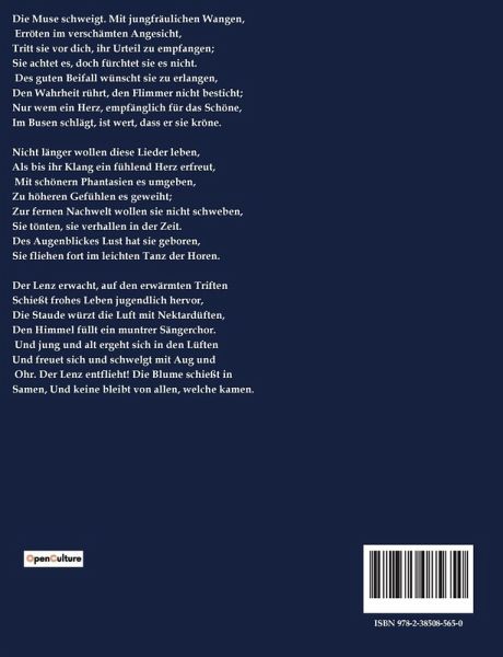 "Einige Gedichte" ist eine Sammlung von Gedichten des berühmten deutschen Dichters Friedrich Schiller. Diese Sammlung umfasst eine Vielzahl von Themen, die von der Natur und der Liebe bis hin zu philosophischen und moralischen Überlegungen reichen. Schiller, bekannt für seine tiefgründigen und oft emotionalen Werke, erforscht in diesen Gedichten die menschliche Erfahrung und die Beziehung des Individuums zur Welt um ihn herum. Die Gedichte sind in einer klaren und prägnanten Sprache verfasst, die sowohl die Schönheit als auch die Komplexität der behandelten Themen einfängt. In "Abschied vom…mehr