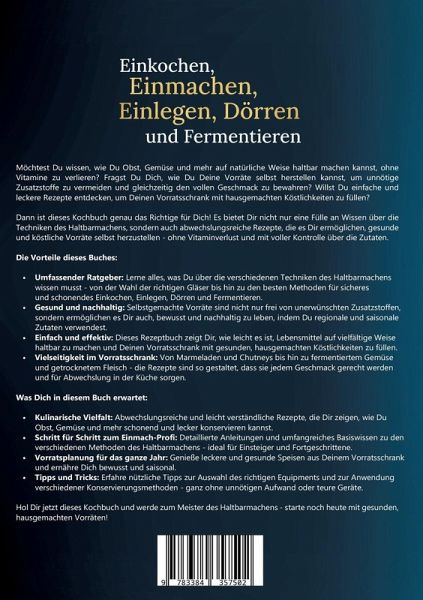 Möchtest Du wissen, wie Du Obst, Gemüse und mehr auf natürliche Weise haltbar machen kannst, ohne Vitamine zu verlieren? Fragst Du Dich, wie Du Deine Vorräte selbst herstellen kannst, um unnötige Zusatzstoffe zu vermeiden und gleichzeitig den vollen Geschmack zu bewahren? Willst Du einfache und leckere Rezepte entdecken, um Deinen Vorratsschrank mit hausgemachten Köstlichkeiten zu füllen?Dann ist dieses Kochbuch genau das Richtige für Dich! Es bietet Dir nicht nur eine Fülle an Wissen über die Techniken des Haltbarmachens, sondern auch abwechslungsreiche Rezepte, die es Dir ermöglichen, gesunde und köstliche Vorräte selbst herzustellen - ohne Vitaminverlust und mit voller Kontrolle über die Zutaten.Die Vorteile dieses Buches:- Umfassender Ratgeber: Lerne alles, was Du über die verschiedenen Techniken des Haltbarmachens wissen musst - von der Wahl der richtigen Gläser bis hin zu den besten Methoden für sicheres und schonendes Einkochen, Einlegen, Dörren und Fermentieren.- Gesund und nachhaltig: Selbstgemachte Vorräte sind nicht nur frei von unerwünschten Zusatzstoffen, sondern ermöglichen es Dir auch, bewusst und nachhaltig zu leben, indem Du regionale und saisonale Zutaten verwendest.- Einfach und effektiv: Dieses Rezeptbuch zeigt Dir, wie leicht es ist, Lebensmittel auf vielfältige Weise haltbar zu machen und Deinen Vorratsschrank mit gesunden, hausgemachten Köstlichkeiten zu füllen.- Vielseitigkeit im Vorratsschrank: Von Marmeladen und Chutneys bis hin zu fermentiertem Gemüse und getrocknetem Fleisch - die Rezepte sind so gestaltet, dass sie jedem Geschmack gerecht werden und für Abwechslung in der Küche sorgen.Was Dich in diesem Buch erwartet:- Kulinarische Vielfalt: Abwechslungsreiche und leicht verständliche Rezepte, die Dir zeigen, wie Du Obst, Gemüse und mehr schonend und lecker konservieren kannst.- Schritt für Schritt zum Einmach-Profi: Detaillierte Anleitungen und umfangreiches Basiswissen zu den verschiedenen Methoden des Haltbarmachens - idealfür Einsteiger und Fortgeschrittene.- Vorratsplanung für das ganze Jahr: Genieße leckere und gesunde Speisen aus Deinem Vorratsschrank und ernähre Dich bewusst und saisonal.- Tipps und Tricks: Erfahre nützliche Tipps zur Auswahl des richtigen Equipments und zur Anwendung verschiedener Konservierungsmethoden - ganz ohne unnötigen Aufwand oder teure Geräte.Hol Dir jetzt dieses Kochbuch und werde zum Meister des Haltbarmachens - starte noch heute mit gesunden, hausgemachten Vorräten!