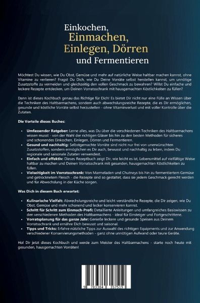 Möchtest Du wissen, wie Du Obst, Gemüse und mehr auf natürliche Weise haltbar machen kannst, ohne Vitamine zu verlieren? Fragst Du Dich, wie Du Deine Vorräte selbst herstellen kannst, um unnötige Zusatzstoffe zu vermeiden und gleichzeitig den vollen Geschmack zu bewahren? Willst Du einfache und leckere Rezepte entdecken, um Deinen Vorratsschrank mit hausgemachten Köstlichkeiten zu füllen?Dann ist dieses Kochbuch genau das Richtige für Dich! Es bietet Dir nicht nur eine Fülle an Wissen über die Techniken des Haltbarmachens, sondern auch abwechslungsreiche Rezepte, die es Dir ermöglichen, gesunde und köstliche Vorräte selbst herzustellen - ohne Vitaminverlust und mit voller Kontrolle über die Zutaten.Die Vorteile dieses Buches:- Umfassender Ratgeber: Lerne alles, was Du über die verschiedenen Techniken des Haltbarmachens wissen musst - von der Wahl der richtigen Gläser bis hin zu den besten Methoden für sicheres und schonendes Einkochen, Einlegen, Dörren und Fermentieren.- Gesund und nachhaltig: Selbstgemachte Vorräte sind nicht nur frei von unerwünschten Zusatzstoffen, sondern ermöglichen es Dir auch, bewusst und nachhaltig zu leben, indem Du regionale und saisonale Zutaten verwendest.- Einfach und effektiv: Dieses Rezeptbuch zeigt Dir, wie leicht es ist, Lebensmittel auf vielfältige Weise haltbar zu machen und Deinen Vorratsschrank mit gesunden, hausgemachten Köstlichkeiten zu füllen.- Vielseitigkeit im Vorratsschrank: Von Marmeladen und Chutneys bis hin zu fermentiertem Gemüse und getrocknetem Fleisch - die Rezepte sind so gestaltet, dass sie jedem Geschmack gerecht werden und für Abwechslung in der Küche sorgen.Was Dich in diesem Buch erwartet:- Kulinarische Vielfalt: Abwechslungsreiche und leicht verständliche Rezepte, die Dir zeigen, wie Du Obst, Gemüse und mehr schonend und lecker konservieren kannst.- Schritt für Schritt zum Einmach-Profi: Detaillierte Anleitungen und umfangreiches Basiswissen zu den verschiedenen Methoden des Haltbarmachens - idealfür Einsteiger und Fortgeschrittene.- Vorratsplanung für das ganze Jahr: Genieße leckere und gesunde Speisen aus Deinem Vorratsschrank und ernähre Dich bewusst und saisonal.- Tipps und Tricks: Erfahre nützliche Tipps zur Auswahl des richtigen Equipments und zur Anwendung verschiedener Konservierungsmethoden - ganz ohne unnötigen Aufwand oder teure Geräte.Hol Dir jetzt dieses Kochbuch und werde zum Meister des Haltbarmachens - starte noch heute mit gesunden, hausgemachten Vorräten!