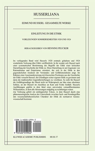 From the reviews of the first edition: "In this volume we have Husserl's lectures on ethics ... . The editor, Henning Peuker, has provided the reader with a very good introduction and the footnotes he has supplied are often helpful in regard to historical details. ... the Editor informs us that, for all practical purposes, the division of the books into chapters and paragraphs, with their corresponding headings are his own work, based on his judgements of what the material is about. I found these both illuminating and accurate." (James G. Hart, Husserl Studies, Vol. 22, 2006)