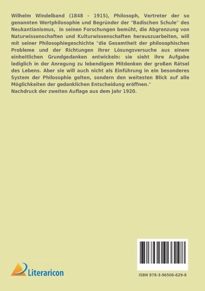 Wilhelm Windelband (1848 - 1915), Philosoph, Vertreter der so genannten Wertphilosophie und Begründer der "Badischen Schule" des Neukantianismus, in seinen Forschungen bemüht, die Abgrenzung von Naturwissenschaften und Kulturwissenschaften herauszuarbeiten, will mit seiner Philosophiegeschichte "die Gesamtheit der philosophischen Probleme und der Richtungen ihrer Lösungsversuche aus einem einheitlichen Grundgedanken entwickeln: sie sieht ihre Aufgabe lediglich in der Anregung zu lebendigem Mitdenken der großen Rätsel des Lebens. Aber sie will auch nicht als Einführung in ein besonderes System der Philosophie gelten, sondern den weitesten Blick auf alle Möglichkeiten der gedanklichen Entscheidung eröffnen." Nachdruck der zweiten Auflage aus dem Jahr 1920.