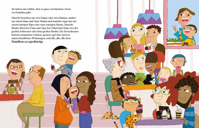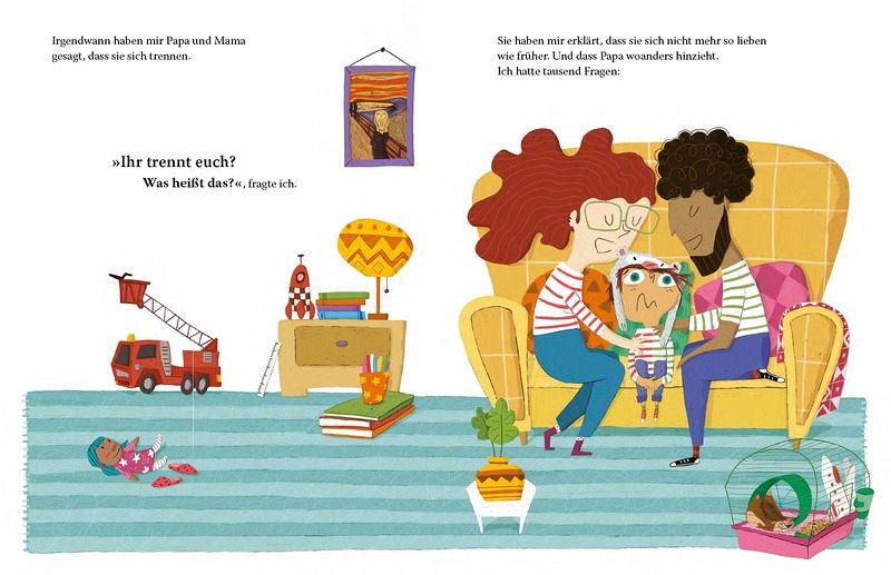 Die Geschichte beschreibt aus Sicht des Kindes die Trennung der Eltern, mit allen Gefühlen, die dabei ein Rolle spielen. Die einfachen Zeichnungen auf weißem Hintergrund bilden sehr gut diese Gefühle ab. Da stehen die Eltern, die sich gerade noch schmatzend geküsst haben, Rücken an Rücken. Beide halten ein Smartphone in der Hand mit dem Icon „Mülleimer“. Da ist der traurige Mund des Kindes eine Schlangenlinie oder schreiend weit geöffnet. Oft ist es in Verkleidung zu sehen und ich kann nicht wirklich das Geschlecht festmachen, so werden sich alle Kinder angesprochen fühlen. Obwohl es hier um eine Familie mit Vater-Mutter-Kind handelt, werden andere Formen der Familie erklärt. Ein wirklich sehr gelungenes Bilderbuch zum Thema Trennung.