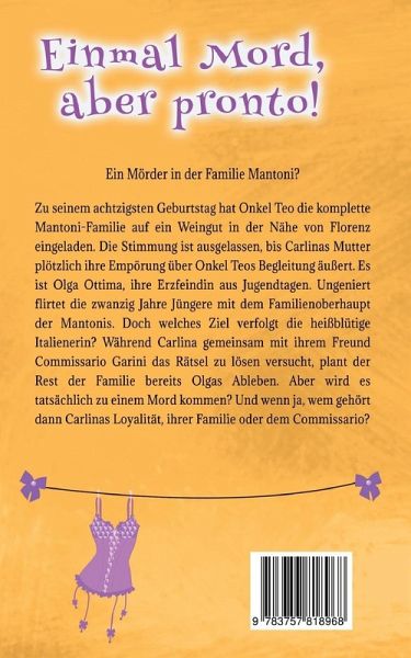 Ein Mörder in der Familie Mantoni?Zu seinem achtzigsten Geburtstag hat Onkel Teo die komplette Mantoni-Familie auf ein Weingut in der Nähe von Florenz eingeladen. Die Stimmung ist ausgelassen, bis Carlinas Mutter plötzlich ihre Empörung über Onkel Teos Begleitung äußert. Es ist Olga Ottima, ihre Erzfeindin aus Jugendtagen. Ungeniert flirtet die zwanzig Jahre Jüngere mit dem Familienoberhaupt der Mantonis. Doch welches Ziel verfolgt die heißblütige Italienerin?Während Carlina gemeinsam mit ihrem Freund Commissario Garini das Rätsel zu lösen versucht, plant der Rest der Familie bereits Olgas Ableben. Aber wird es tatsächlich zu einem Mord kommen? Und wenn ja, wem gehört dann Carlinas Loyalität, ihrer Familie oder dem Commissario?
