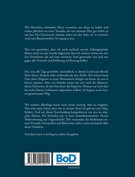 Wir Menschen schmieden Pläne, versuchen uns daran zu halten und stehen plötzlich vor einer Tatsache, die mit unserem Plan gar nichts zu tun hat. Das Unerwartete kommt selten aus der Ecke, wo es vermutet wird, eine Binsenweisheit. So erging es uns. Was war geschehen, dass ich mich suchend umsah, Selbstgespräche führte, mich von der Familie abgrenzte. Dass ich verloren schien wie eine fast Ertrunkene, die auf einer einsamen Insel gestrandet war und nun gegen alle Vernunft und Erfahrung auf Rettung hoffte? Das, was alle Tage geschieht, tausendfach, in diesem Land und überall. Mein Mann Thomas sollte sterbenskrank sein: Krebs. Wir hatten kaum Zeit, diese Diagnose in unser Bewusstsein dringen zu lassen, da war er bereits operiert. Aber wie betäubt waren wir erst nach der überstandenen Operation, als die Gutachten der Experten Thomas nur noch drei bis sechs Monate Lebenszeit zu-gestehen wollten. So begann unser letzter kurzer gemeinsamer Weg. Wir suchten allerdings nach einem Ausweg,dem zu entgehen. Was wäre mein Leben ohne ihn an meiner Seite? Es gab nur eine Möglichkeit. Und mit dieser Entscheidung katapultierten wir uns ins doppelte Abseits. Wir befanden uns in einer Ausnahmesituation. Unsere Wahrnehmung war eingeschränkt. Wir verstanden die Reaktionen unserer Freunde, Verwandten und Bekannten nicht, waren enttäuscht über deren Verhalten. Und dann kam es doch ganz anders als geplant.