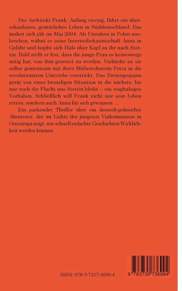 Einmal Stettin - und zurück?Der Architekt Frank, Anfang vierzig, führt ein überschaubares, gemütliches Leben in Süddeutschland. Das ändert sich jäh im Mai 2004: Als Unruhen in Polen ausbrechen, wähnt er seine Internetbekanntschaft Anna in Gefahr und begibt sich Hals über Kopf zu ihr nach Stettin. Bald stellt er fest, dass die junge Frau es keineswegs nötig hat, von ihm gerettet zu werden. Vielmehr ist sie selbst gemeinsam mit ihrer Mitbewohnerin Petra in die revolutionären Umtriebe verstrickt. Das Dreiergespann gerät von einer brenzligen Situation in die nächste, bis nur noch die Flucht aus Stettin bleibt - ein waghalsiges Vorhaben. Schließlich will Frank nicht nur sein Leben retten, sondern auch Anna für sich gewinnen ...Ein packender Thriller über ein deutsch-polnisches Abenteuer, der im Lichte der jüngsten Vorkommnisse in Osteuropa zeigt, wie schnell erdachte Geschichten Wirklichkeit werden können.