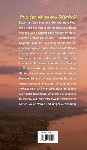 Ein Urlaub wie aus dem Bilderbuch? Davon ist Carolines und Günters erste Flugreise nach Spanien leider meilenweit entfernt: Was mit wenig appetitlichen Funden im Hotelzimmer und ungenießbarer Frühstückskost beginnt, kulminiert in einem Hotelbrand mit Feuerwehrgroßeinsatz. Dass die Costa Blanca auch schöne Seiten hat, bezeugen die feuchtfröhlichen Abende, die das Norddeutsche Ehepaar im Kreis einer kunterbunten Melange an Figuren verbringt. Dabei ist es vor allem Günter, der mit seiner unverfänglichen Art als Partytier Stimmung macht. Caroline Huttel hat einen durchwegs amüsanten Urlaubsrückblick verfasst, reich an Schenkelklopfern, der jedoch auch ganz besonders eines ist: die liebevolle Rückschau auf ihren mittlerweile verstorbenen Gatten, voller Wärme und inniger Zuwendung.