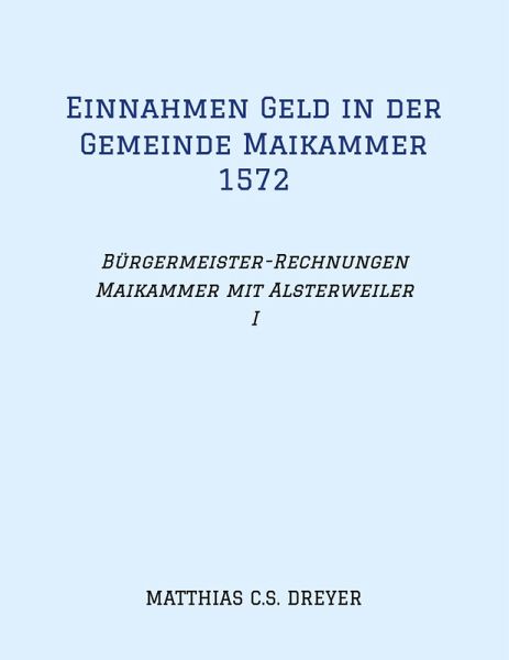 Das Buch enthält die Edition der Einnahmenrechnung aus dem Jahre 1572 für die Gemeinde Maikammer mit Alsterweiler. Neben der Übertragung werden die Familiennamen und die Inhalte der Einungen erläutert.