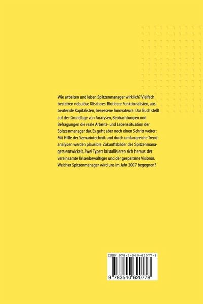 Wie arbeiten und leben Spitzenmanager wirklich? Vielfach bestehen nebulöse Klischees: Blutleere Funktionalisten, ausbeutende Kapitalisten, besessene Innovateure. Das Buch stellt auf der Grundlage von Analysen, Beobachtungen und Befragungen die reale Arbeits- und Lebenssituation der Spitzenmanager dar. Es geht aber noch einen Schritt weiter: Mit Hilfe er Szenariotechnik und untermauert durch umfangreiche Trendanalysen werden plausible Zukunftsbilder des Spitzenmanagers entwickelt. Zwei Typen kristallisieren sich heraus: der "vereinsamte Krisenbewältiger" und der "gespaltene Visionär". Welcher Spitzenmanager wird uns 2007 begegnen?