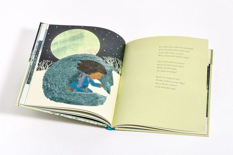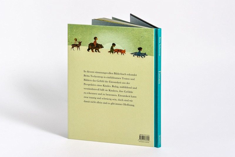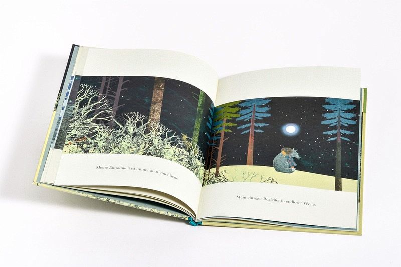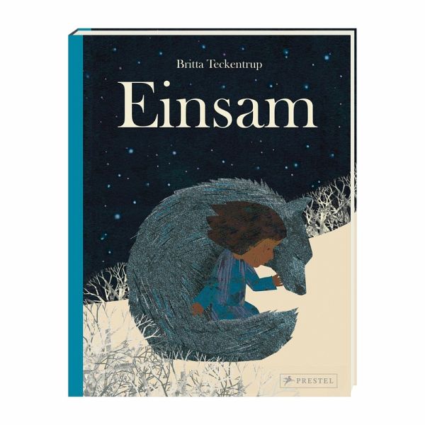 Wolf durch die Bäume streichen. „Werde ich für immer so einsam sein?“ fragt sich das Mädchen und er…mehrSchon das in dunklen Farben gehaltene Cover lässt und die Verlorenheit des Kindes spüren. So sehen wir das Mädchen durch die fallenden Schneeflocken nur im Kleid und mit nackten Füssen laufen. „Ich bin ganz allein“ lässt sie uns wissen. Obwohl sie glaubt, ganz allein im Wald zu sein, sehen wir einen Wolf durch die Bäume streichen. „Werde ich für immer so einsam sein?“ fragt sich das Mädchen und er Wolf kommt ihr dabei näher. Auf der nächsten Seite gibt es nur graue Buchstaben auf grauem Hintergrund, „es bleibt alles grau.“ Der Wolf, den sie dann umarmt ist die Einsamkeit, ihr einziger Begleiter. Noch eine Textseite, die die Einsamkeit beschreibt. Die beiden heulen zum Mond und es gibt viel Fragen, die sich das Mädchen stellt „Und wird alles gut?“ Doch dann keimt auch etwas Hoffnung auf und das Mädchen fasst Mut und hofft auf einen Menschen, der ihr vertraut. Da tauchen noch andere Kinder auf, die auch mit Waldtieren unterwegs sind. So wir am Ende aus der Einsamkeit eine Zweisamkeit.