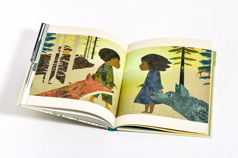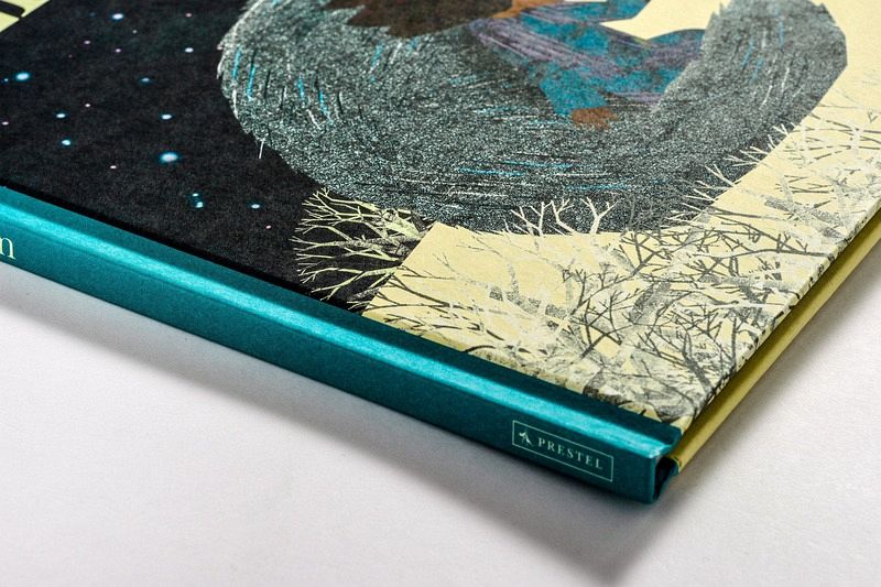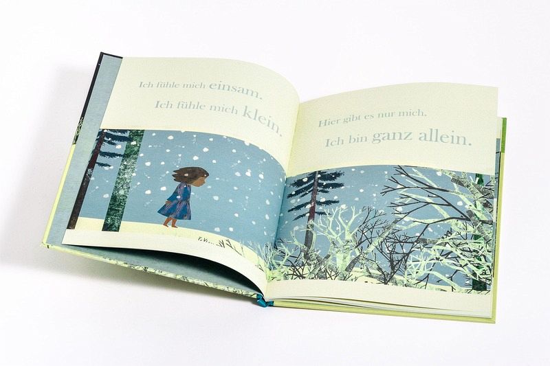 Schon das in dunklen Farben gehaltene Cover lässt und die Verlorenheit des Kindes spüren. So sehen wir das Mädchen durch die fallenden Schneeflocken nur im Kleid und mit nackten Füssen laufen. „Ich bin ganz allein“ lässt sie uns wissen. Obwohl sie glaubt, ganz allein im Wald zu sein, sehen wir einen