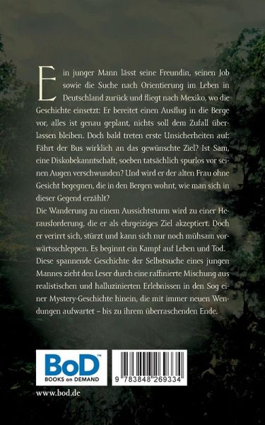 Ein junger Mann lässt seine Freundin, seinen Job sowie die Suche nach Orientierung im Leben in Deutschland zurück und fliegt nach Mexiko, wo die Geschichte einsetzt: Er bereitet einen Ausflug in die Berge vor, alles ist genau geplant, nichts soll dem Zufall überlassen bleiben. Doch bald treten erste Unsicherheiten auf: Fährt der Bus wirklich an das gewünschte Ziel? Ist Sam, eine Diskobekanntschaft, soeben tatsächlich spurlos vor seinen Augen verschwunden? Und wird er der alten Frau ohne Gesicht begegnen, die in den Bergen wohnt, wie man sich in dieser Gegend erzählt? Die Wanderung zu einem Aussichtsturm wird zu einer Herausforderung, die er als ehrgeiziges Ziel akzeptiert. Doch er verirrt sich, stürzt und kann sich nur noch mühsam vorwärtsschleppen. Es beginnt ein Kampf auf Leben und Tod. Diese spannende Geschichte der Selbstsuche eines jungen Mannes zieht den Leser durch eine raffinierte Mischung aus realistischen und halluzinierten Erlebnissen in den Sog einer Mystery-Geschichte hinein, die mit immer neuen Wendungen aufwartet - bis zu ihrem überraschenden Ende.