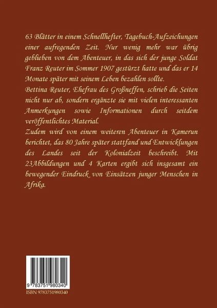 63 Blätter in einem Schnellhefter, Tagebuch-Aufzeichungen einer aufregenden Zeit. Nur wenig mehr war übrig geblieben von dem Abenteuer, in das sich der junge Soldat Franz Reuter im Sommer 1907 gestürzt hatte und das er 14 Monate später mit seinem Leben bezahlen sollte. Bettina Reuter, Ehefrau des Großneffen, schrieb die Seiten nicht nur ab, sondern ergänzte sie mit vielen interessanten Anmerkungen sowie Informationen durch seitdem veröffentlichtes Material. Zudem wird von einem weiteren Abenteuer in Kamerun berichtet, das 80 Jahre später stattfand und Entwicklungen des Landes seit der Kolonialzeit beschreibt. Mit 23 Abbildungen und 4 Karten ergibt sich insgesamt ein bewegender Eindruck von Einsätzen junger Menschen in Afrika.