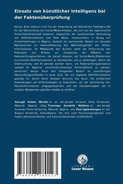 Dieses Buch befasst sich mit der Anwendung von Künstlicher Intelligenz (KI) für die Überprüfung von Social-Media-Inhalten, die sich auf die nigerianische Sicherheitslandschaft beziehen. Angesichts der zunehmenden Verbreitung von Fehlinformationen und Fake News, insbesondere in Bezug auf Sicherheitsfragen in Nigeria, besteht ein wachsender Bedarf an robusten Mechanismen zur Authentifizierung des Wahrheitsgehalts von Online-Informationen. Im Mittelpunkt des Buches steht die Erforschung des Potenzials von KI-Tools zur Steigerung der Effizienz von Faktenprüfungsverfahren, die darauf abzielen, auf Social-Media-Plattformen kursierende Fehlinformationen zu überwachen und zu widerlegen. Durch die Untersuchung, wie KI genutzt werden kann, um Faktenprüfungsprozesse speziell für Nigerias sicherheitsrelevanten Online-Diskurs zu stärken, adressiert dieses Buch den dringenden Bedarf an zuverlässigen Überprüfungsmethoden in einer Zeit, die von digitalen Fehlinformationen geprägt ist. Durch diese Analyse versucht das Buch, die praktischen Anwendungen von KI-Technologien zu beleuchten, um der Verbreitung von Falschinformationen entgegenzuwirken und die Glaubwürdigkeit der in sozialen Netzwerken geteilten Inhalte zu erhöhen.