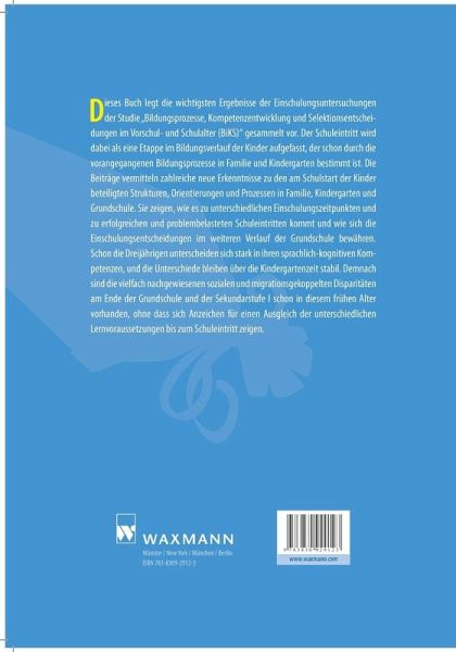Dieses Buch legt die wichtigsten Ergebnisse der Einschulungsuntersuchungen der Studie "Bildungsprozesse, Kompetenzentwicklung und Selektionsentscheidungen im Vor- und Schulalter (BiKS)" gesammelt vor. Der Schuleintritt wird dabei als eine Etappe im Bildungsverlauf der Kinder aufgefasst, der schon durch die vorangegangenen Bildungsprozesse in Familie und Kindergarten bestimmt ist. Die Beiträge vermitteln zahlreiche neue Erkenntnisse zu den am Schulstart der Kinder beteiligten Strukturen, Orientierungen und Prozessen in Familie, Kindergarten und Grundschule. Sie zeigen, wie es zu unterschiedlichen Einschulungszeitpunkten und zu erfolgreichen und problembelasteten Schuleintritten kommt und wie sich die Einschulungsentscheidungen im weiteren Verlauf der Grundschule bewähren. Schon die Dreijährigen unterscheiden sich stark in ihren sprachlich-kognitiven Kompetenzen, und die Unterschiede bleiben über die Kindergartenzeit stabil. Demnach sind die vielfach nachgewiesenen sozialen und migrationsgekoppelten Disparitäten am Ende der Grundschule und der Sekundarstufe I schon in diesem frühen Alter vorhanden, ohne dass sich Anzeichen für einen Ausgleich der unterschiedlichen Lernvoraussetzungen bis zum Schuleintritt zeigen.