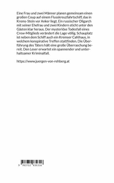 Eine Frau und zwei Männer planen gemeinsam einen großen Coup auf einem Flusskreuzfahrtschiff, das in Krems-Stein vor Anker liegt. Ein russischer Oligarch mit seiner Ehefrau und zwei Kindern sticht unter den Gästen klar heraus. Der mysteriöse Todesfall eines Crew-Mitglieds verändert die Lage völlig. Schauplatz ist neben dem Schiff auch ein Kremser Caféhaus, in welchem konspirative Treffen stattfinden. Die Überführung des Täters hält eine große Überraschung bereit. Den Leser erwartet ein spannender und unterhaltsamer Kriminalfall.