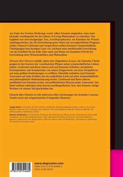 Einstein über Einstein enthält, neben den Originaltext, Essays, die Einsteins Überlegungen in den Kontext der verschiedenen Phasen seines wissenschaftlichen Lebens stellen. Gutfreund und Renn stützen sich auf Einsteins Schriften, persönliche Korrespondenz und Kommentare von seinen Zeitgenossen, um neue Perspektiven auf seine größten Entdeckungen zu eröffnen. Ebenfalls enthalten sind Einsteins Antworten auf seine Kritiker, die ein zusätzliches Licht auf seine wissenschaftliche und philosophische Weltanschauung werfen. Gutfreund und Renn zitieren ausführlich aus Einsteins ersten, unveröffentlichten Skizzen seiner Antworten. Der Band umfasst außerdem einen kurzen autobiografischen Text, den Einstein wenige Wochen vor seinem Tod geschrieben hat.