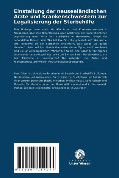 Eine Umfrage unter mehr als 900 Ärzten und Krankenschwestern in Neuseeland über ihre Unterstützung oder Ablehnung der wahrscheinlichen Legalisierung einer Form der Sterbehilfe in Neuseeland. Einige der behandelten Themen sind: Was hat Ihre Einstellung beeinflusst? Was würde Ihre Teilnahme an der Sterbehilfe erleichtern, was würde Sie davon abhalten? Unter welchen Umständen sollte sie verfügbar sein? Wie bereit sind Sie, an AD teilzunehmen? Würden Sie AD als eine Option für Ihr eigenes Lebensende unterstützen? Was erwarten Sie von Ihrem Berufsverband, um Ihre Teilnahme zu unterstützen? Die Antworten von Ärzten und Krankenschwestern werden verglichen/gegenübergestellt.