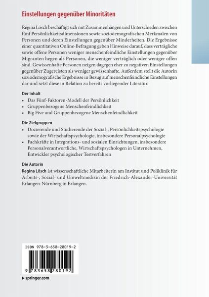 Regina Lösch beschäftigt sich mit Zusammenhängen und Unterschieden zwischen fünf Persönlichkeitsdimensionen sowie soziodemografischen Merkmalen von Personen und deren Einstellungen gegenüber Minderheiten. Die Ergebnisse einer quantitativen Online-Befragung geben Hinweise darauf, dass verträgliche sowie offene Personen weniger menschenfeindliche Einstellungen gegenüber Migranten hegen als Personen, die weniger verträglich oder weniger offen sind. Gewissenhafte Personen neigen dagegen eher zu negativen Einstellungen gegenüber Zugereisten als weniger gewissenhafte. Außerdem stellt die Autorin soziodemografische Ergebnisse in Bezug auf menschenfeindliche Einstellungen dar und setzt diese in Relation zu bereits vorliegender Literatur.